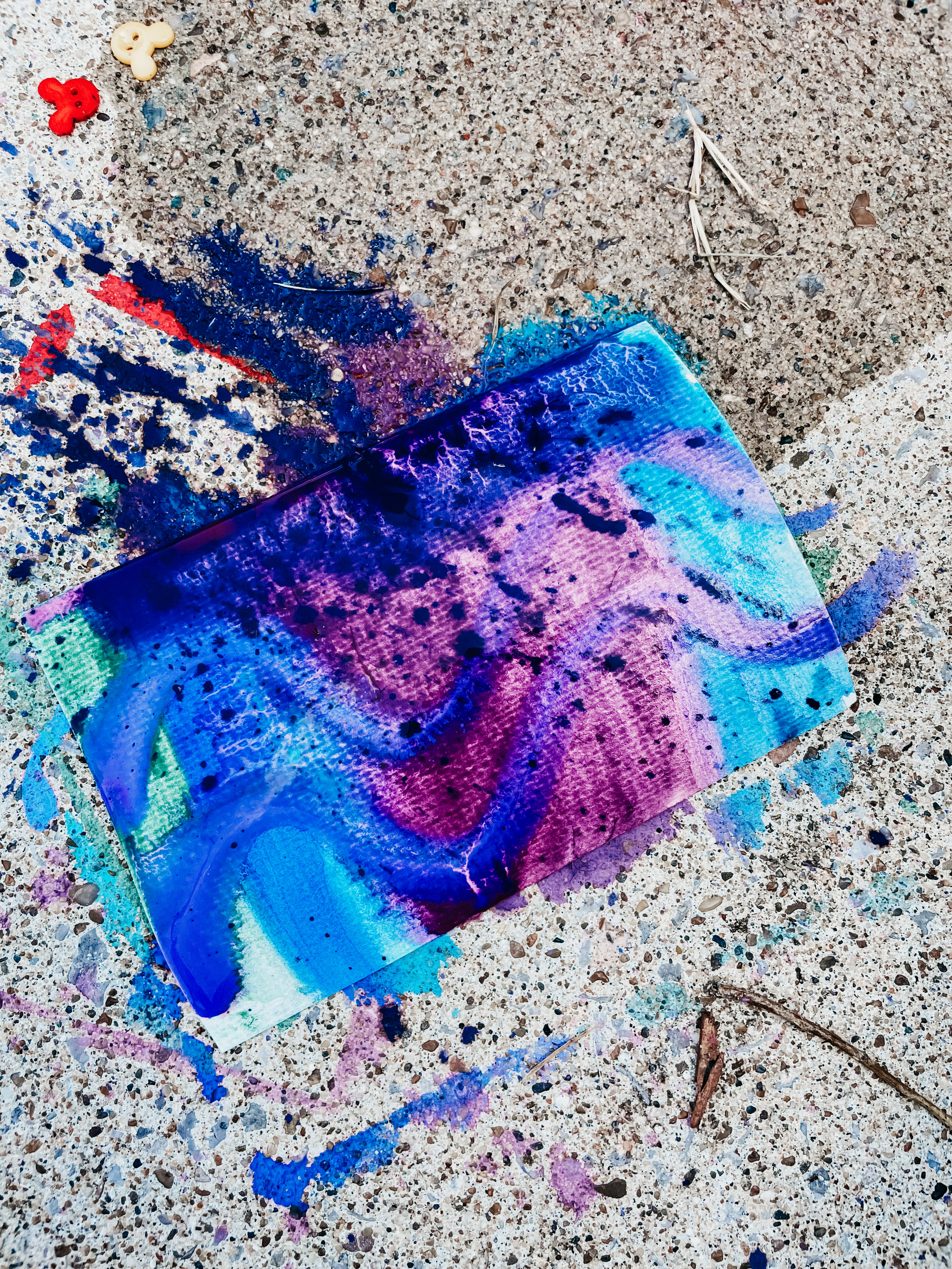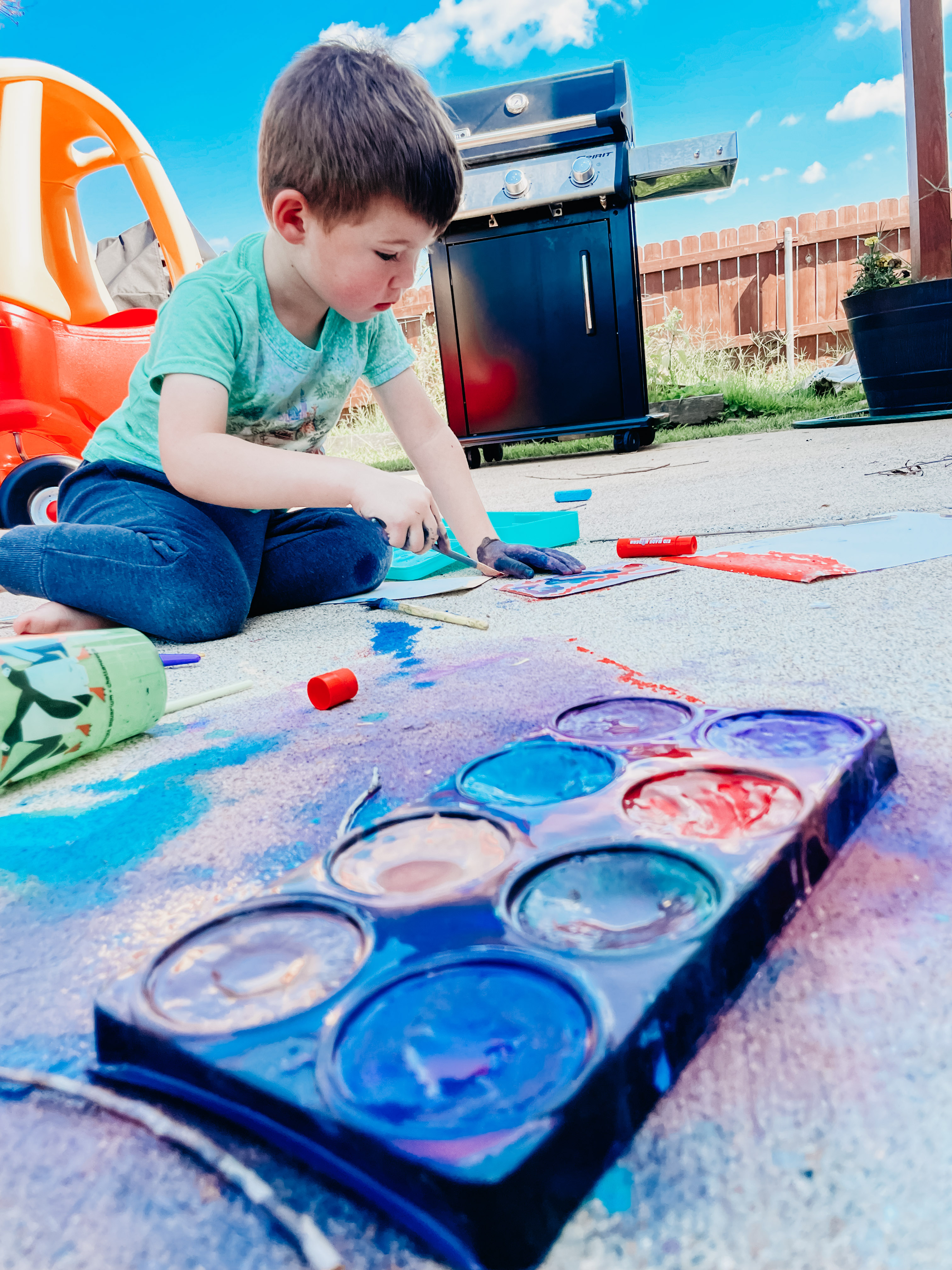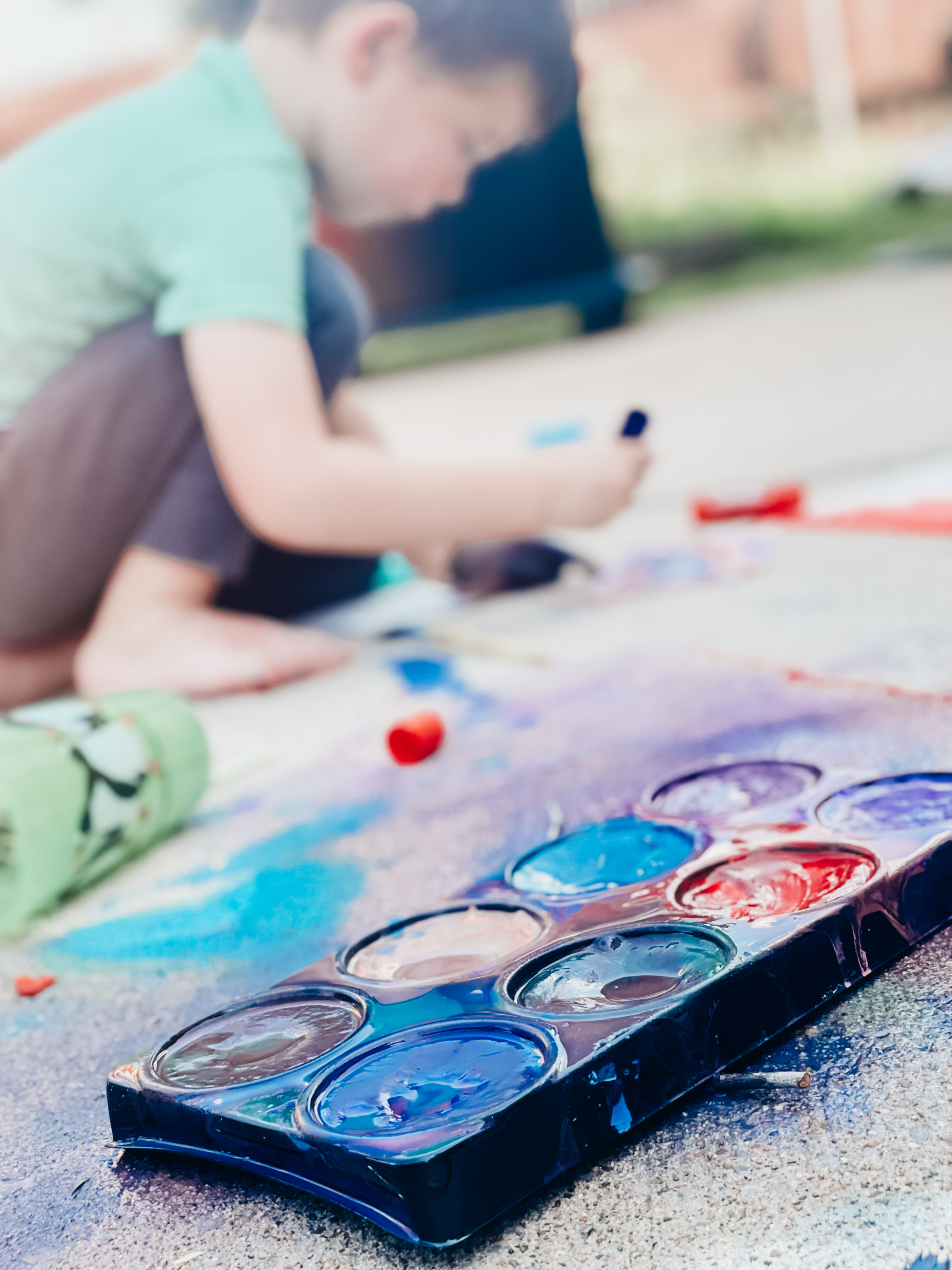 Preparing Your Painting Space: If you have a concrete patio or sidewalk, that’s great, but if not, you can put down an old sheet in the grass to sit on! The best part about painting outside, is that you can just wash it off, without worrying about messing anything up like your furniture. You’ll want to gather your painting supplies and make sure to have plenty of water and snacks.